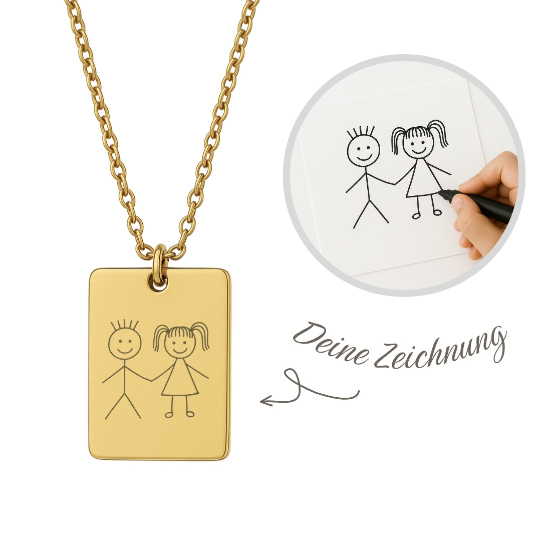 Ob Kinderzeichnung, kleine Skizze oder persönliches Symbol – mit dieser einzigartigen Gravurkette kannst du dein Wunschmotiv verewigen. Wir verwandeln deine Zeichnung in eine detailgetreue Lasergravur auf einem hochwertigen Anhänger aus Edelstahl oder 18 Karat vergoldet. So entsteht ein emotionales Schmuckstück mit ganz besonderer Bedeutung.