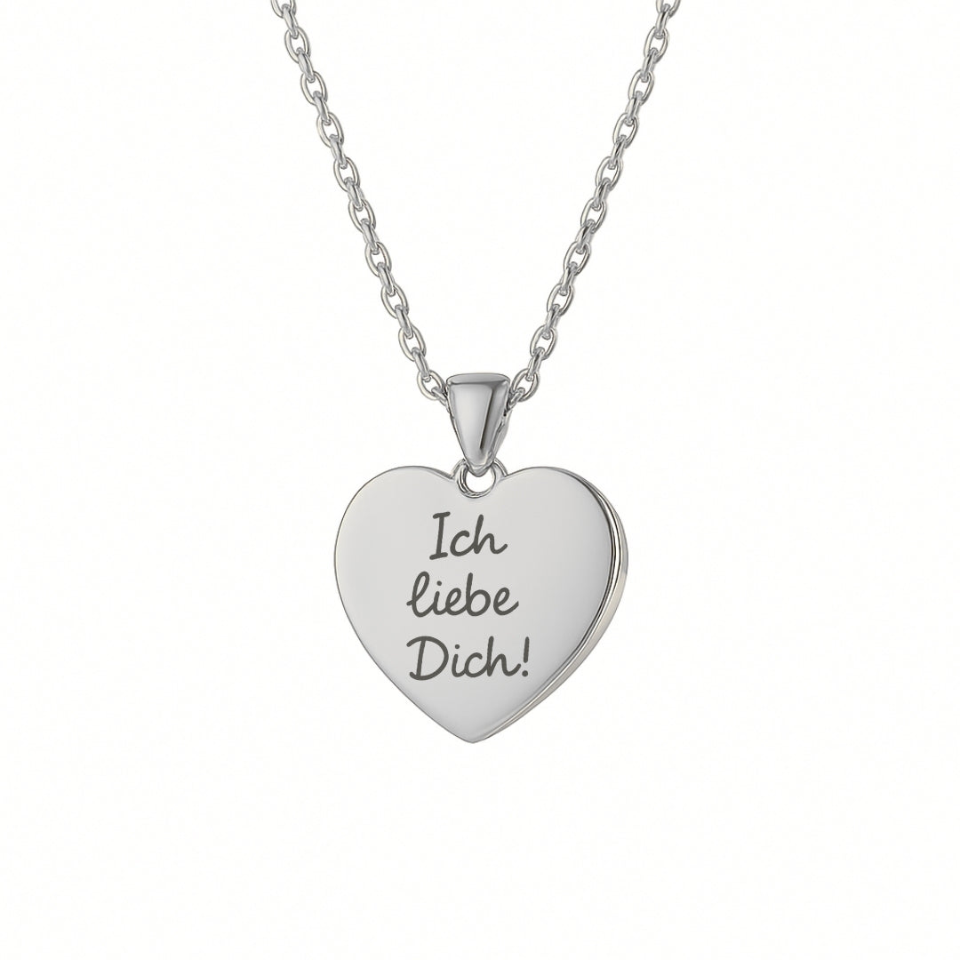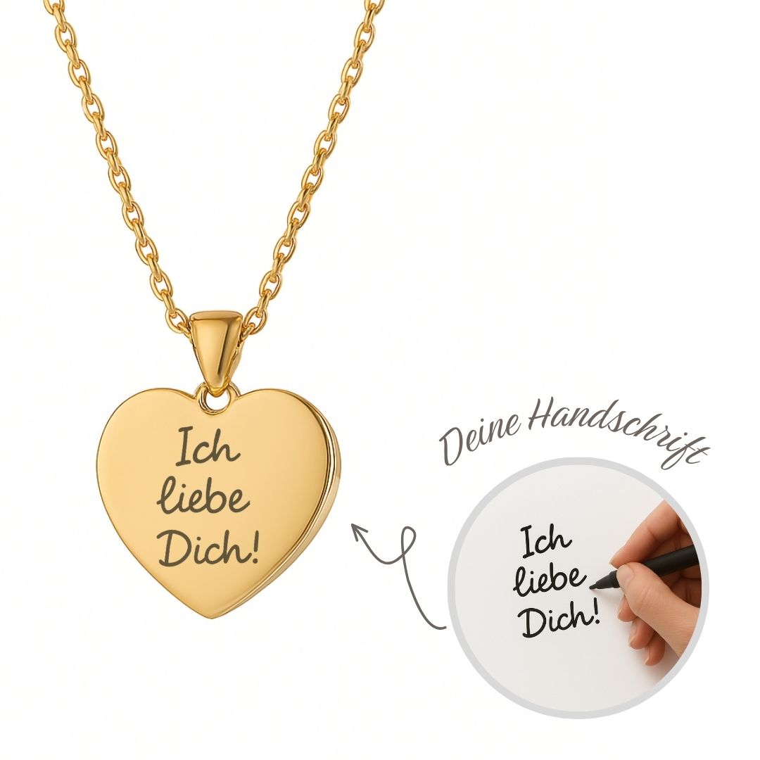 Verschenke ein ganz persönliches Schmuckstück mit Bedeutung: Unsere gravierte Herz-Halskette wird mit deiner eigenen Handschrift veredelt. Egal ob eine Liebesbotschaft, ein Name oder ein einzelnes Wort – dein handgeschriebener Text wird originalgetreu auf das Herz-Anhänger graviert.