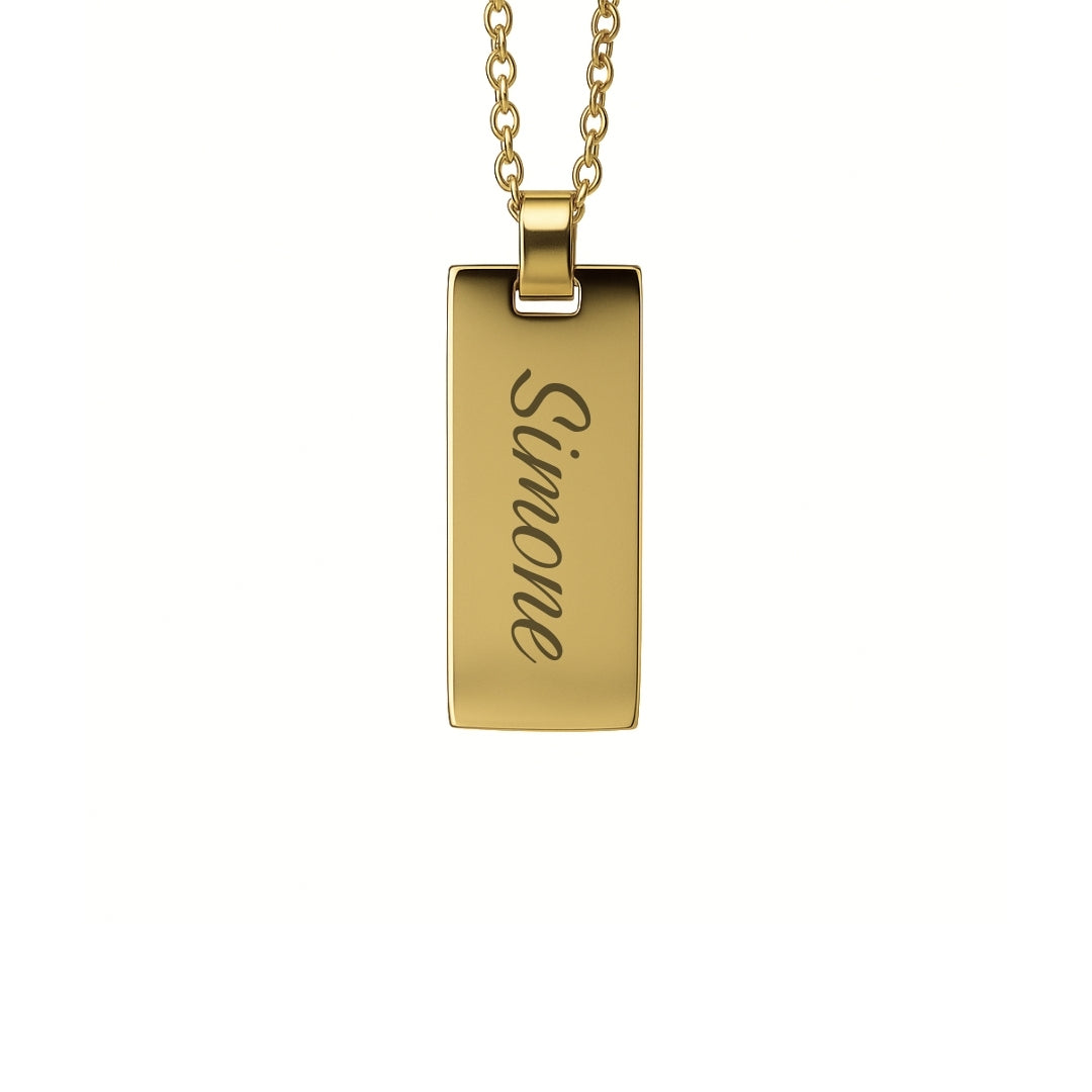 Diese stilvolle Namenskette ist das perfekte Geschenk für besondere Menschen oder ein persönliches Schmuckstück für dich selbst. Der schlichte rechteckige Anhänger (10 x 25 mm) wird individuell mit deinem gewünschten Namen, Wort oder kurzem Text graviert.
