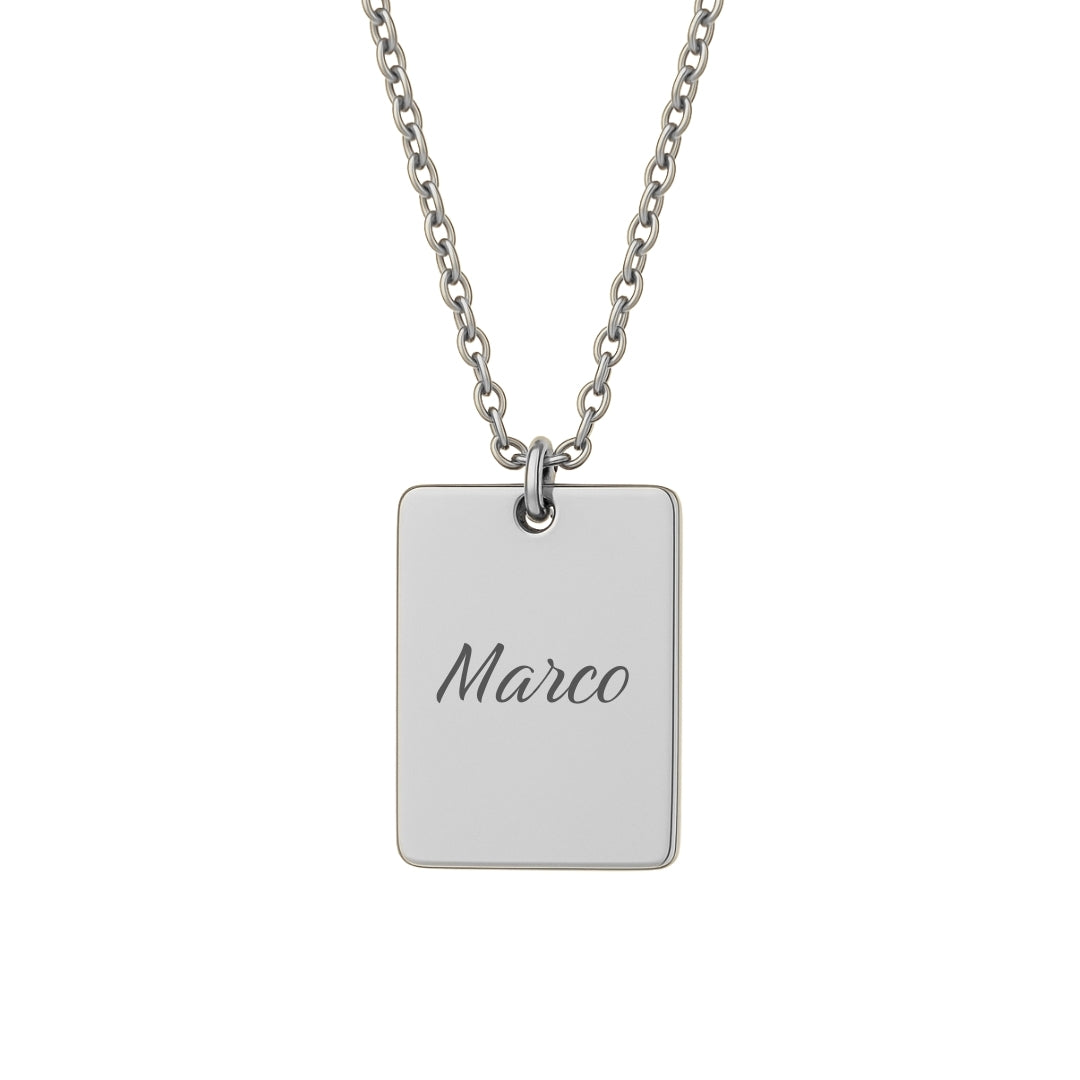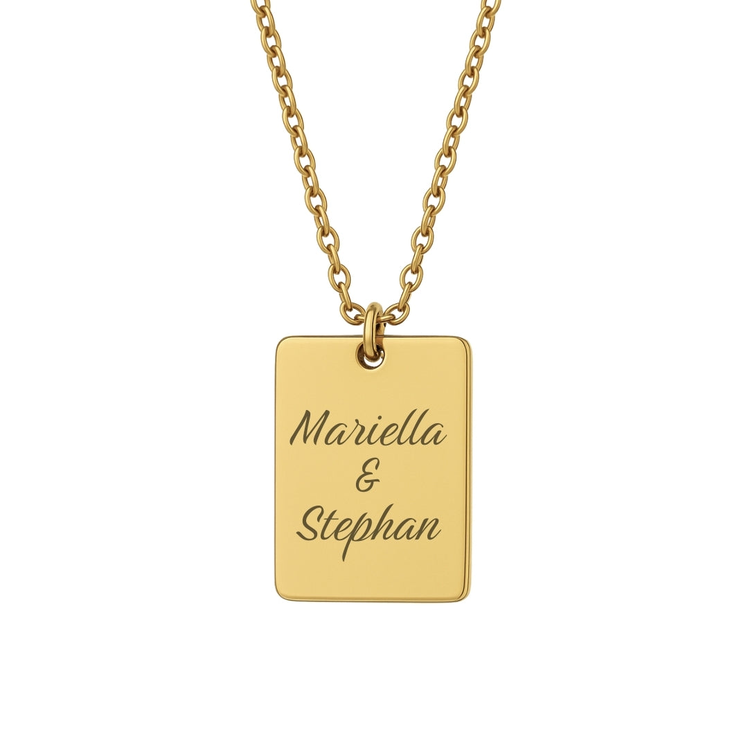 Diese gravierte Namenskette mit eckigen Gravurplättchen ist ein emotionales Schmuckstück, das ganz dir gehört. Wähle einen Namen, ein Datum oder zwei persönliche Zeilen – wir gravieren deinen Wunschtext sorgfältig und stilvoll auf einen hochwertigen Edelstahl-Anhänger. Perfekt als Geschenk oder für dich selbst.